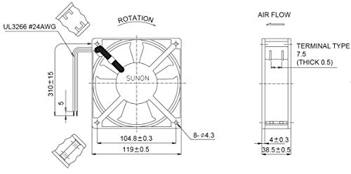 SUNON DP200A-2123XBT-R AC Fan Ball, 220 VAC, 117 CFM, Terminals, UL/CSA/TUV, 120 mm L x 120 mm W x 38 mm H