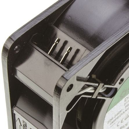 Details: AC tubeaxial fan, features: Ball bearing Rated voltage: 220VAC Current: 120mA Air flow: 117 CFM, noise: 50 dBA, size: 120 x 120 x 38 mm, terminal connection, agency approvals: UL/CSA/TUV/CE.