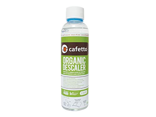 Details: Cafetto Liquid Organic Descaler is concentrated and designed to decalcify (delime or descale) espresso machine water tanks and coffee brewing equipment. The organic range of cleaners gives you that peace of mind, while also getting your machine sparkling clean, and most importantly protecting that delicious coffee flavour and aroma. Organically certified, this 1 litre/34oz bottle provides 8 doses. Safe to use on aluminium, brass and stainless steel. Directions: 1) Ensure the white cap is tightly sealed first, then slightly loosen the green cap. Gently squeeze the bottle until reservoir measures 50ml/1.6oz, then remove the green lid and pour from reservoir. 2) Add 50ml/1.6oz of cleaner to 500ml/17oz of warm water in a stainless steel pitcher. 3) Insert milk frother suction tube into solution. 4) Run entire solution through the frother. 5) Repeat the above procedure with 500ml/17oz of clean water to rinse all the components thoroughly. For use, follow the machine manufacturer's specific instructions for descaling. Always rinse the machine at least twice with fresh water after decalcifying and before re-filling and reusing the machine.
